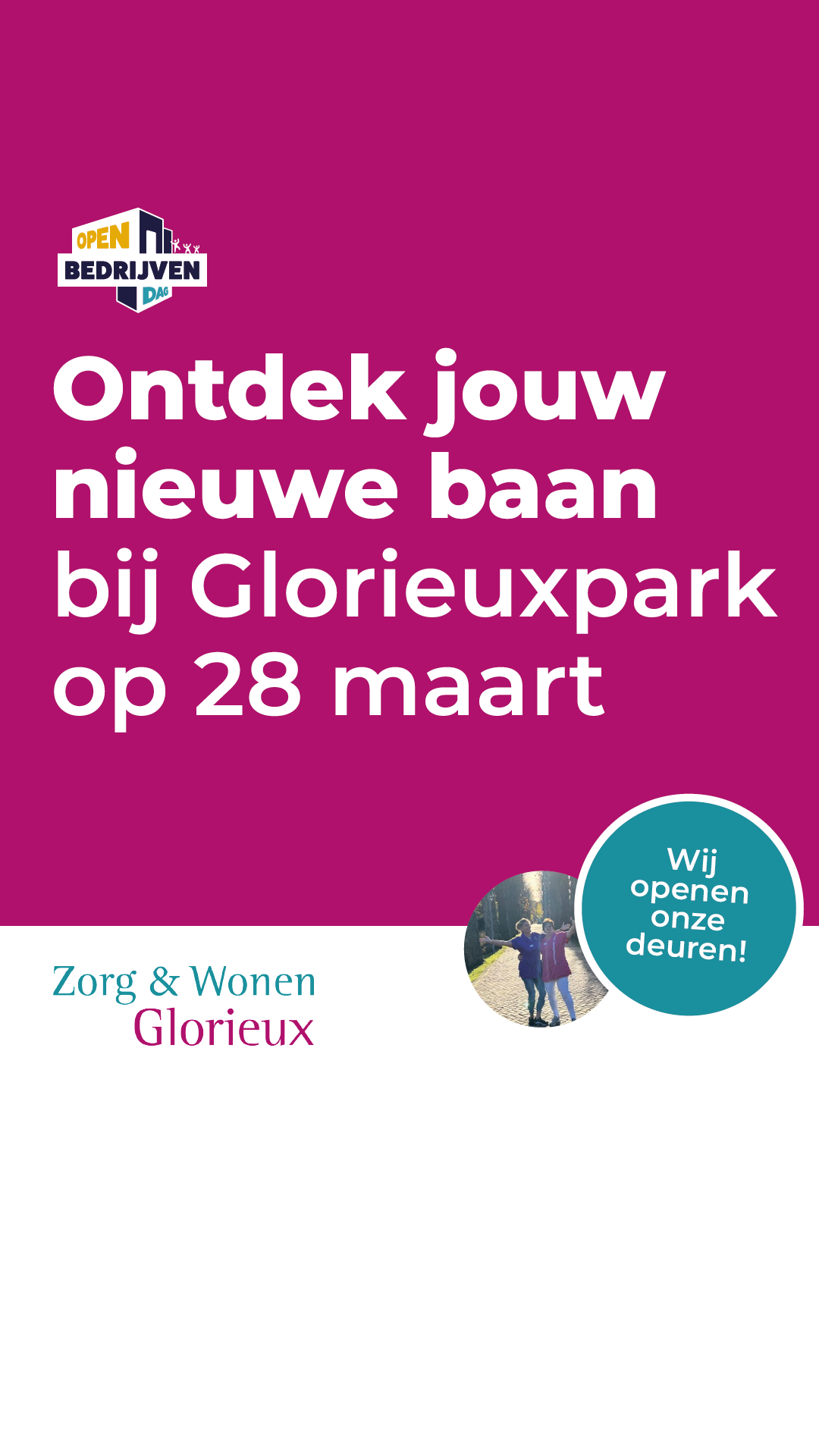 Of je nu nieuwsgierig bent, op zoek bent naar een baan in de zorg, een stageplek, BBL-traject of interesse hebt in samenwerking. Kom langs, laat je verrassen en beleef Glorieuxpark van dichtbij!